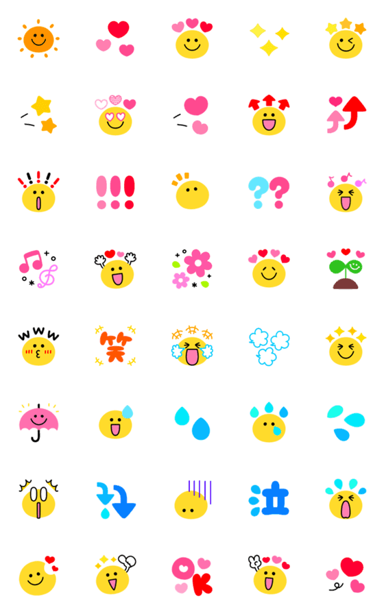 カラフルでかわいいスマイルいっぱいの絵文字です☺︎♡ハートやキラキラなど日常で使いやすい絵柄を厳選しました♩毎日使える/顔文字/スマイル/ニコニコ/ハッピー♡