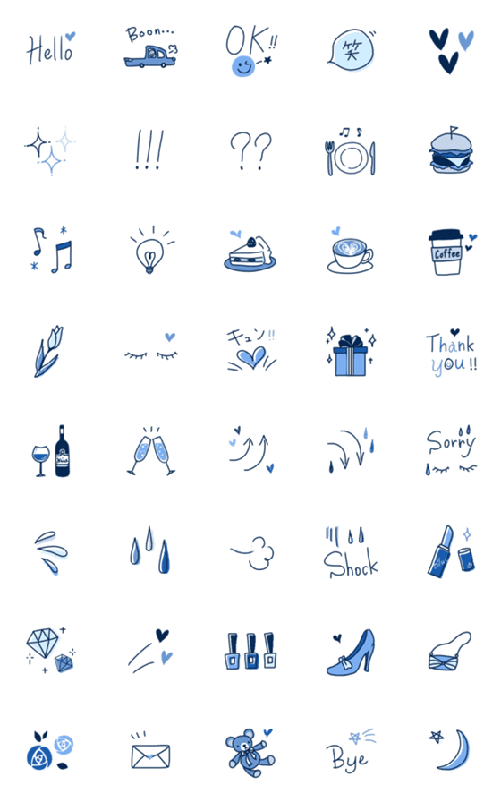 青色ベースの大人かわいい絵文字です。白い縁取りをしてどんな背景にも見やすさ◎ にしました。シンプル/くすみカラー/くすみ色/ブルー/Blue/ハート/日常