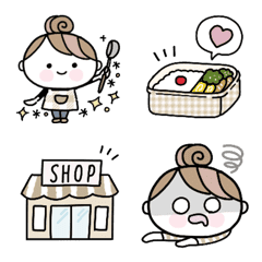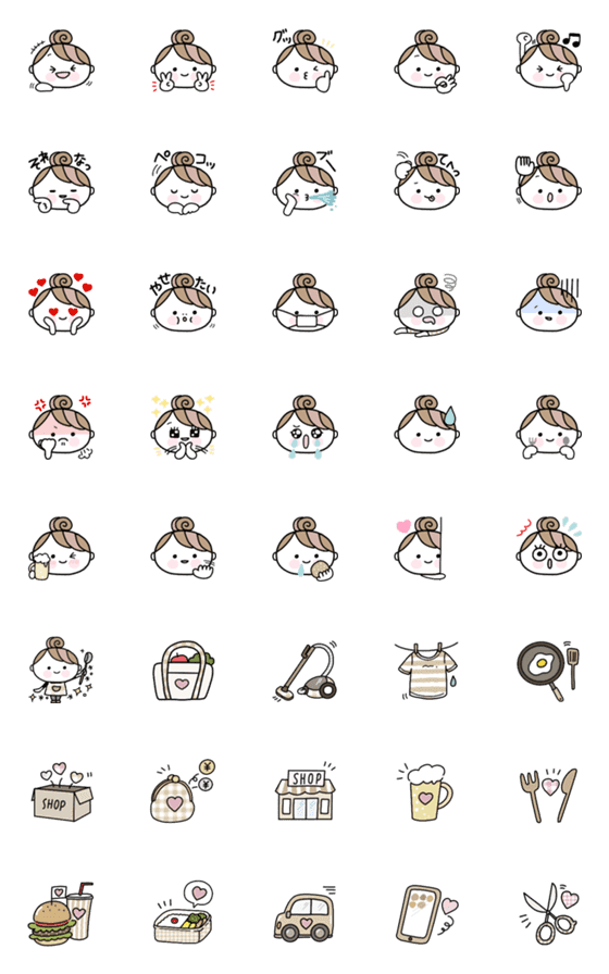 お団子ヘアーが可愛い女の子の顔絵文字に、日常生活で使いやすいベージュ系の色がお洒落な絵文字をプラスしてます♪主婦やママ、家事をする方が使いやすい絵文字です♡