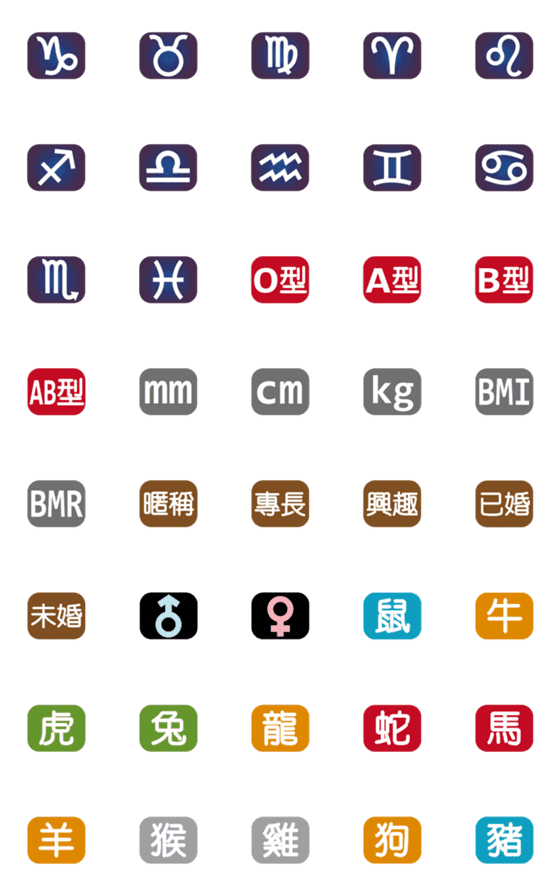 星座、血液型、干支、男性と女性、体重、身長、基礎代謝率、カップ、男性と女性のシンボル、キュートで興味深い、基本的な情報。