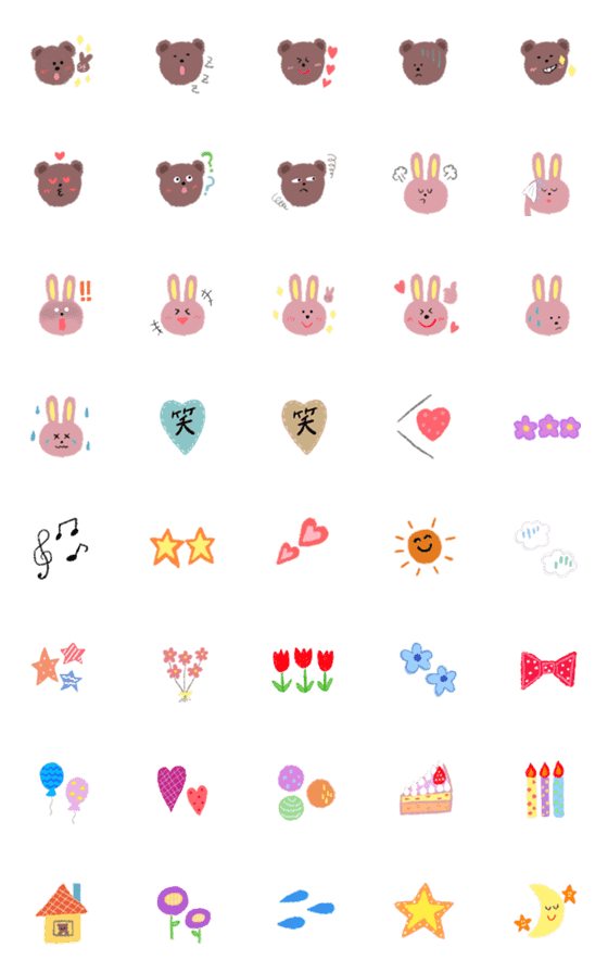 うさぎとくまの絵文字とカラフルな飾りの絵文字もあります。うさぎ/くま/カラフル/装飾