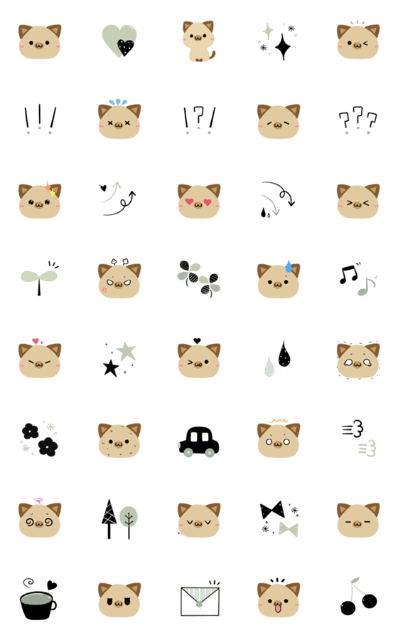 大人女子が毎日使えるシンプルでシャム猫に似てるねこ・トンキニーズの顔文字と北欧風絵文字 くすみカラーの緑と黒 ミニスタンプにも 春夏秋冬 ブラック グリーン 黒猫版も