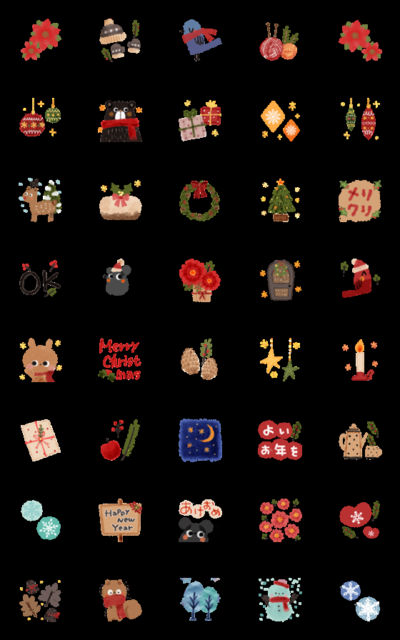 水彩タッチの冬の森の動く絵文字です。クリスマスとお正月をナチュラルな森の動物達が可愛く彩ります。くま/うさぎ/ねずみ/りす/ハート/北欧