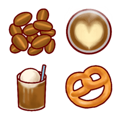 飲み物、食べ物の絵文字です。コーヒーはもちろん、ケーキやアイスなどのおやつもあります。ラテアートもあります。チョコ、イチゴ、抹茶味。カフェ巡りをしているみたい。