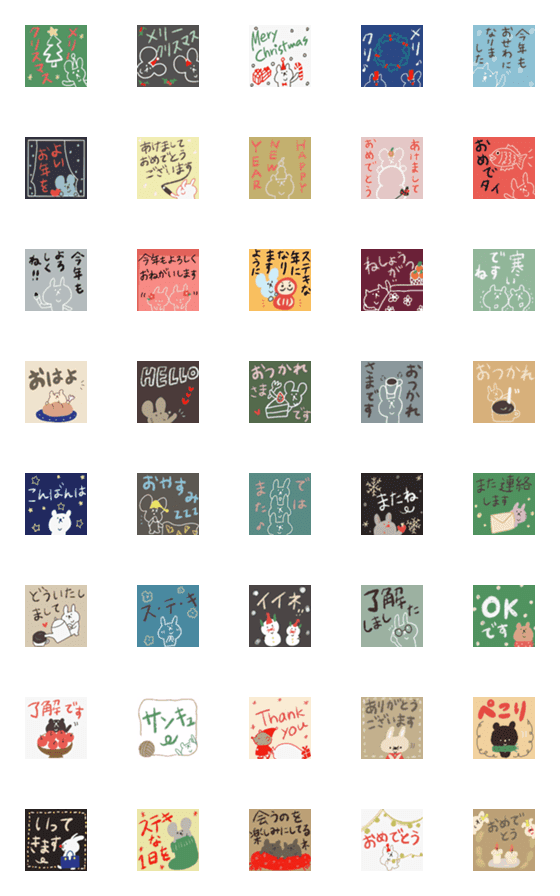 絵本に出てきそうな大人可愛い動物達の絵文字です。そのまま送って小さなスタンプとして使うのがおすすめです。年末年始/クリスマス/冬の日常会話/くすみカラー/敬語付き