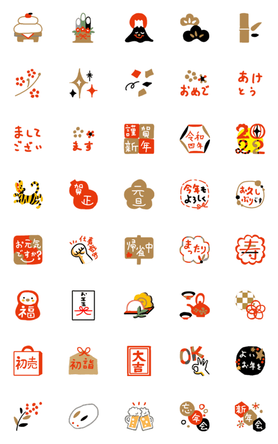 お正月と年末の挨拶用の絵文字。大人も使いやすい、丁寧な言葉とスッキリしたイラストです。年賀状代わりにどうぞ(年末年始の挨拶/寅/松竹梅/縁起物/和飾り/富士山)
