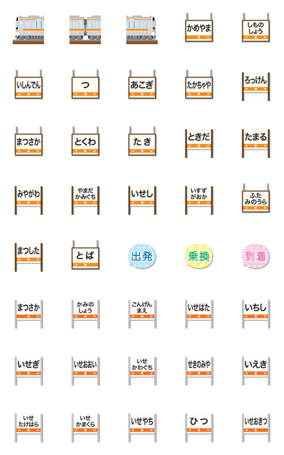 三重県内を走る「橙ラインの電車と駅名標」の絵文字セットです☆ 電車はつなげてミニ車両に☆ 2つの路線を収録しています☆ 連絡/報告用としてどうぞご活用ください^_^