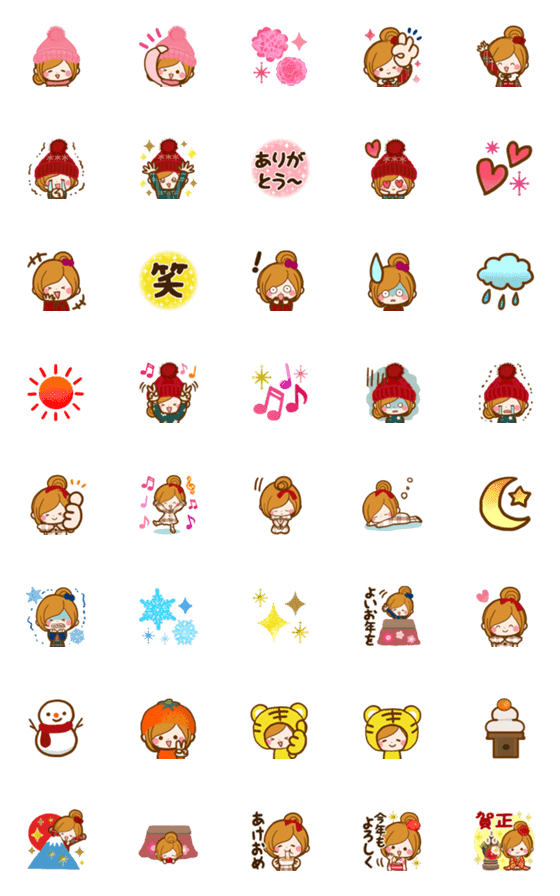 華やかでかわいい冬の絵文字です♪お洋服のバリエーションも豊富にしてみました☆寅年の2022年、素敵な年になりますように☆(「ほのぼのカノジョ」シリーズ)