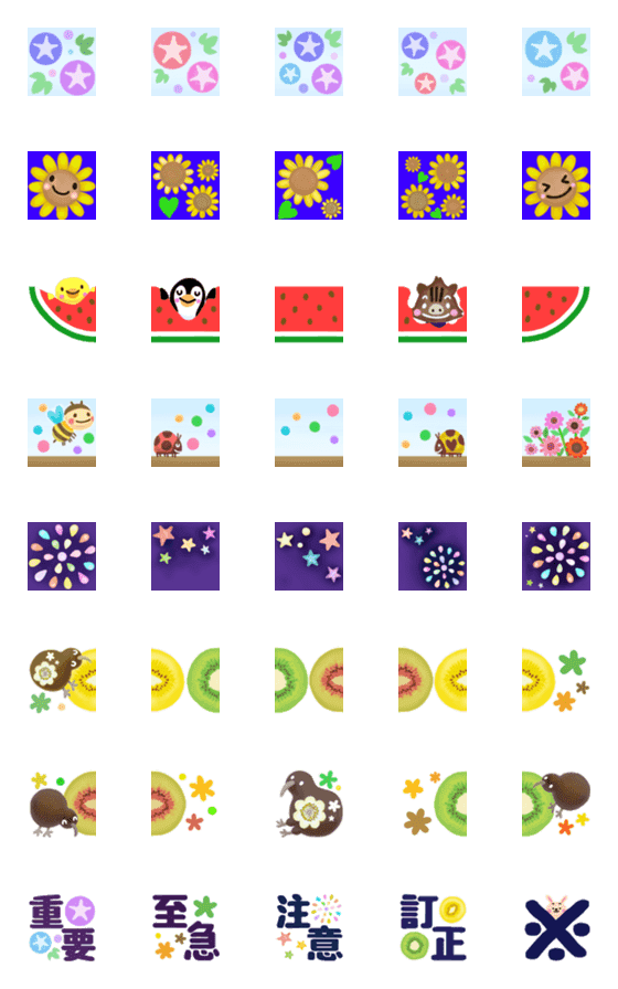 強調/絵本みたいな/summer/暑い季節/花火/すいか/朝顔/ひまわり/お知らせ/グループLINE/連絡事項/役員会/子ども会/行事/夏のイベントに/かわいい/繋がる絵文字/動物/キウイ