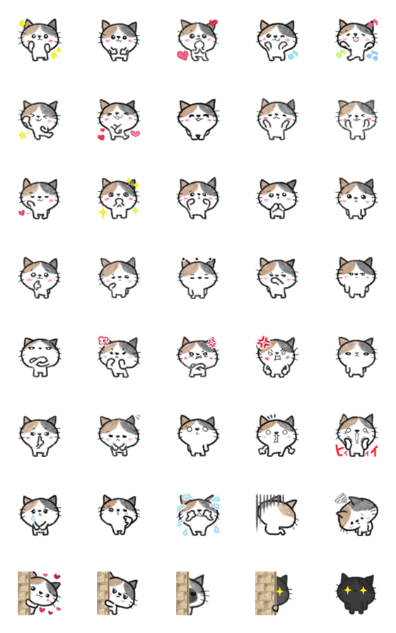三毛猫をクレヨンでふんわりかわいく描いた絵文字です。笑ったり泣いたり、怒ったりしょげたり…目がキラーンと光ったり、今回も毎日を盛り上げてくれること間違いなし!?
