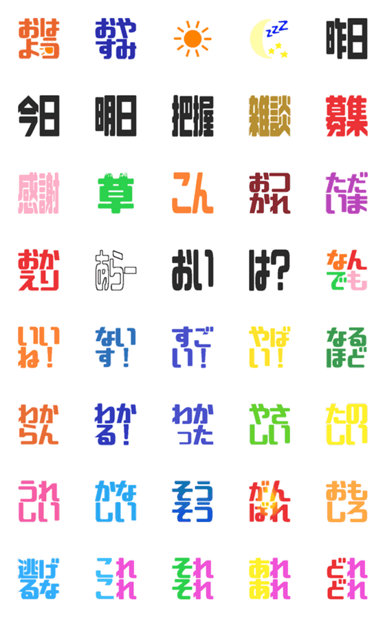 単語を組み文字にして使いやすくした絵文字です。例えば、「おはよう」、「おやすみ」です。