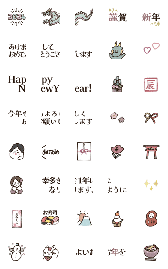 年末年始やお正月に使える絵文字です。あけおめ/2024年/初詣/お年玉/辰年/つなげる文字