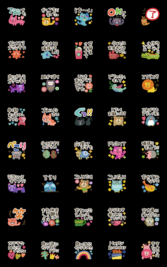 カラフルな動物たちの文字入り絵文字です。小さいスタンプとしても活躍!敬語/挨拶/大人/長文/気遣い