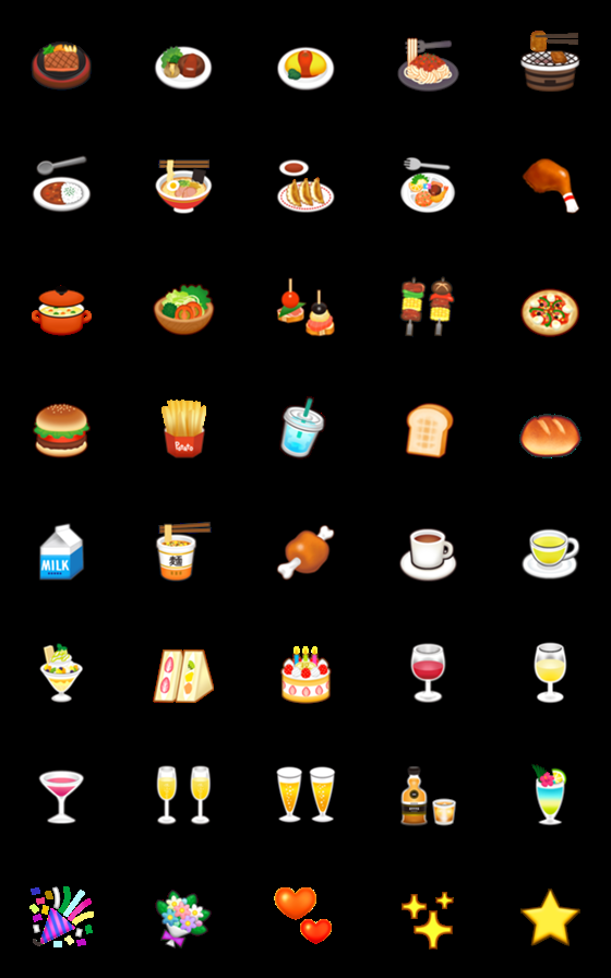 ご馳走。ステーキ、ハンバーグ、焼肉、バーベキュー、お酒、ビール、ワイン、シャンパン、カクテル、誕生日ケーキ、キラキラやお茶等定番系で普段使いに見やすい絵文字。