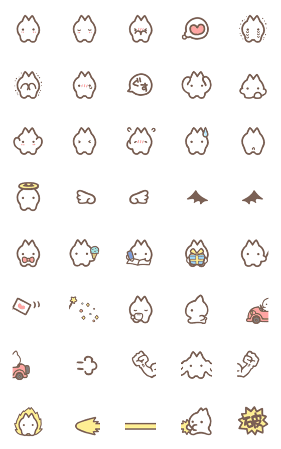 不思議な白い子猫のいろんな動きの絵文字です。繋げたり、「こねこねこねこえもじ・ザ・ハッピー」の記号と組み合わせたりして遊んでね。
