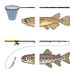 つなげる淡水魚のドット絵の絵文字です。メダカ、オイカワ、タナゴ、ナマズ、ブラックバス、ライギョ、コイ、ヤマメ、アマゴ、イワナなど。