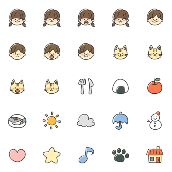 おんなのこ、おとこのこ、ねこ、ごはん、お天気。ふつうのこたちのゆるくてかわいいふつうの絵文字。