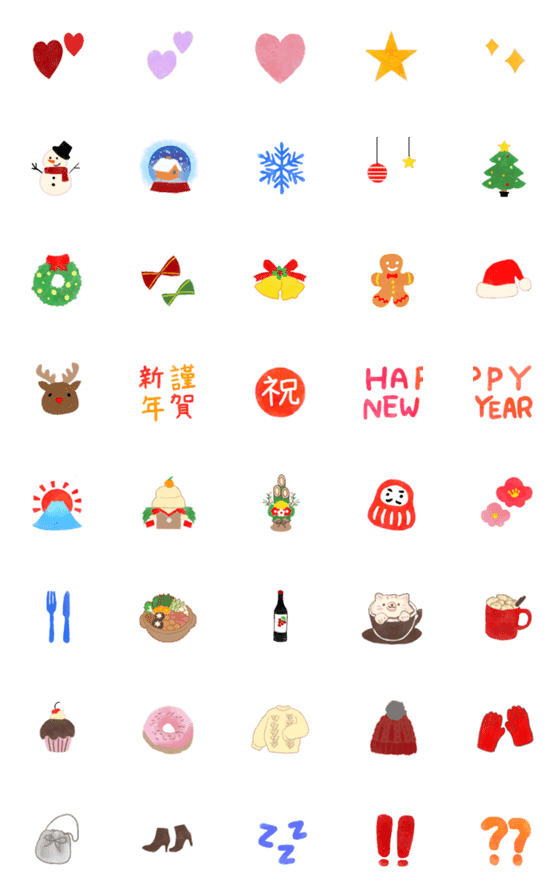 クリスマス、お正月、冬の間使える絵文字です。大人かわいい、シンプル、北欧、ゆるかわ、あけおめ、年越し、カフェ、スイーツ、女子、大晦日、冬休み、定番、手書き風