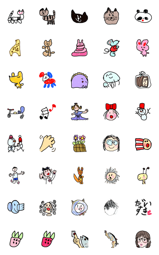 幼稚園児の子供の描いたお絵かきをそのまま絵文字に。大人にも使いやすい且つ子どもらしい味のあるものを選びました♪子供文字と一緒に使うとより可愛いくなるよ/動物多め