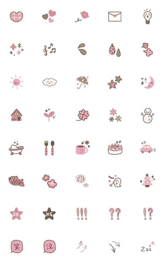 日常会話から季節のイベントまで、年中使えてとっても便利。ブラウン×ピンクの優しい色味が大人かわいい絵文字です。