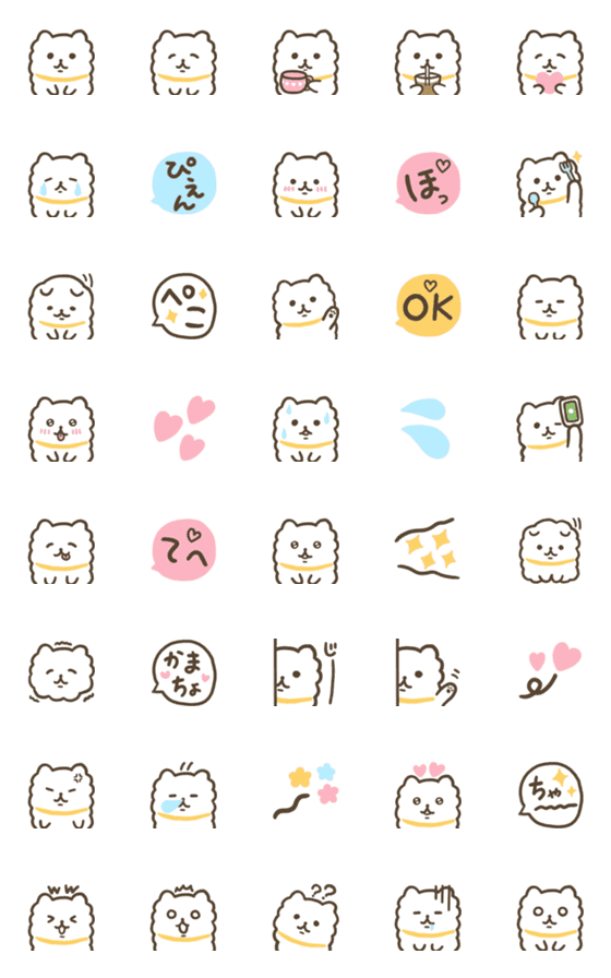 ふわふわで可愛い白いポメラニアンの絵文字だよ。色々組み合わせて楽しんでね。白ポメ/ゆるい/よく使う/パステル