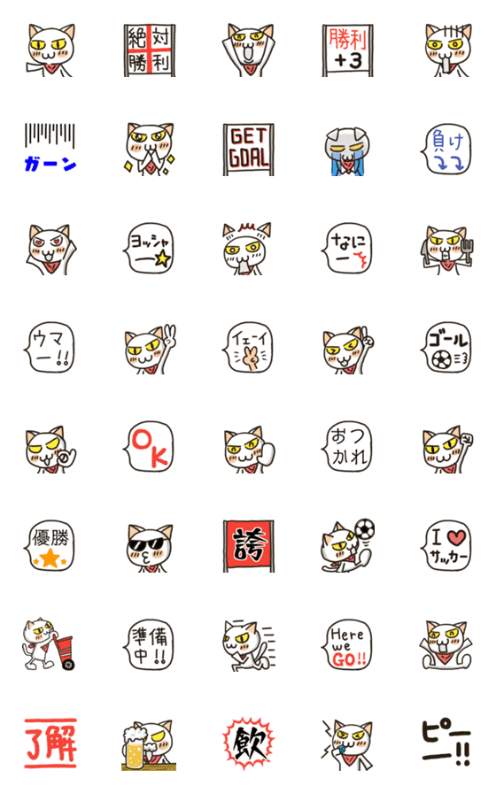 つり目ネコのサッカー観戦に使える絵文字です。日常会話にも使えます。