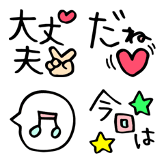 ママ友や仲良し友達に気軽に使える、シンプルな手書き絵文字♪懐かしく見やすいデコ文字手書きテイスト。カラフルで語尾につけやすい絵文字で、トークをデコろう!