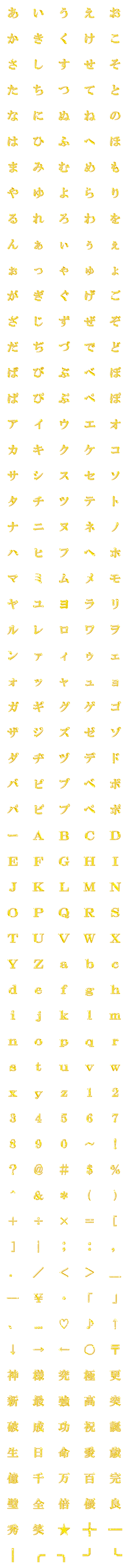 メタリックイエローゴールドのデコ文字です 五十音、アルファベット数字 漢字は「神様究極更新最強突破成功祝誕生日命愛歳億千万百完璧全倍優良秀笑」記号や枠