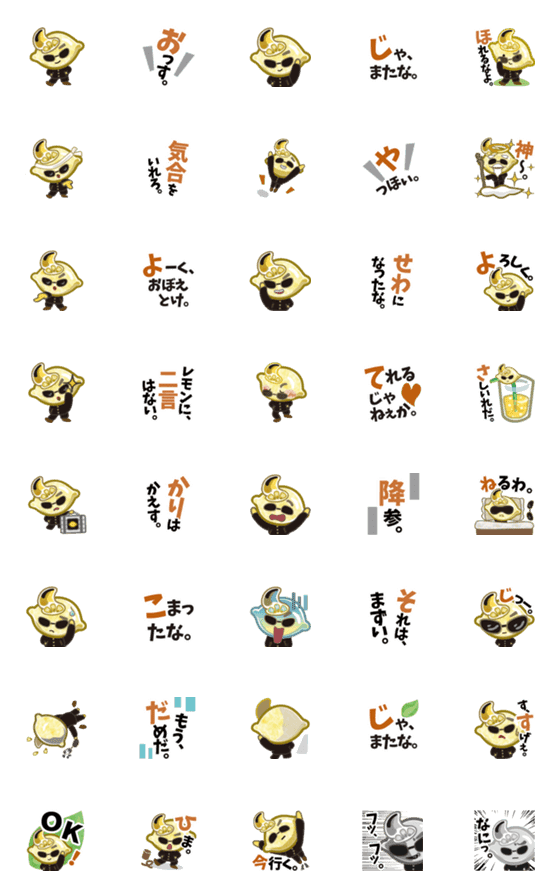 つっぱってるけど一生懸命で優しくて、どこか愛らしい「つっぱりレモンくん」の絵文字・日常編です。皮をめくってリーゼント!絵文字と文字をセットで使ってインパクト大!