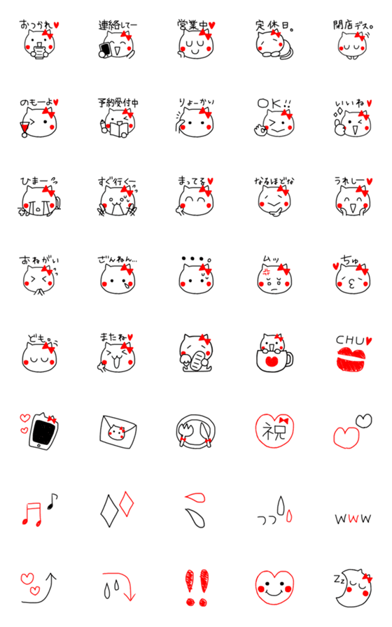 かおるさんの絵文字。ボールペン風。落書き風。かわいい。猫。飲食店の方にも使える。赤。黒。【作:とりいかおる】