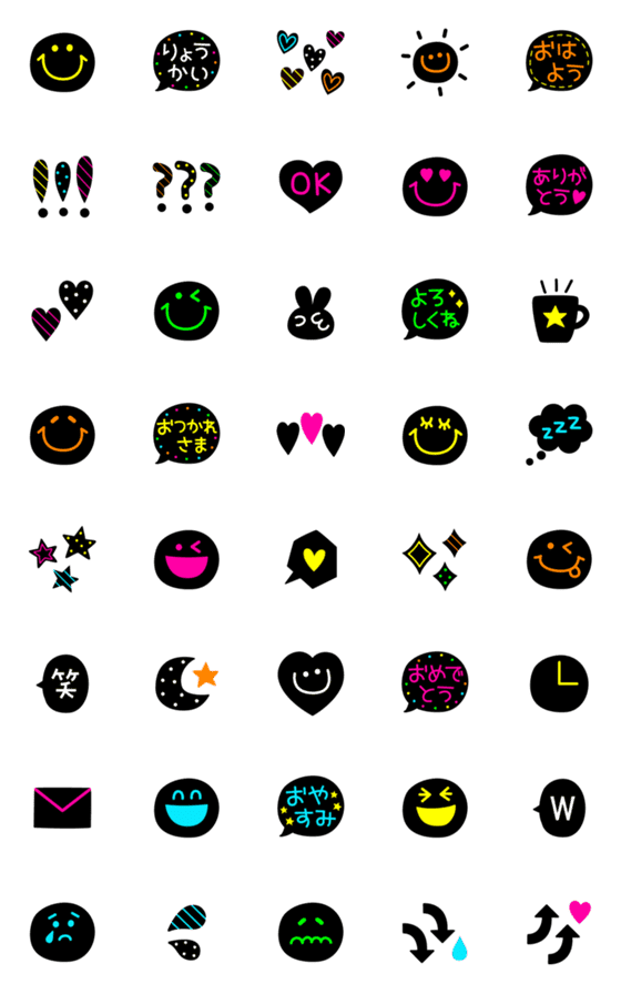 誰にでも使えるシンプルで大人かわいい絵文字*黒ベースにカラフルな蛍光カラーがくっきり見やすい♩スマイル顔文字,ハート,吹き出しなど日常でよく使うものを集めました☺