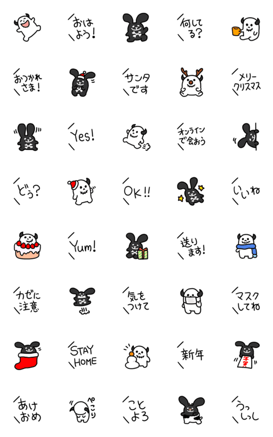 ロック&ポップな黒ウサギと髑髏ちゃんの新しい冬絵文字♥️メリークリスマス/風邪に気をつけて/オンラインで会おう/マスクしてね/あけおめ/ことよろ/牛(丑) など★