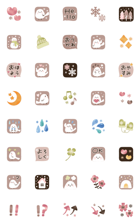 可愛い小鳥の絵文字第三弾です。優しい小鳥達で冬のメッセージを飾ってくださいね。小鳥/冬/優しい/ハート/雪/ベージュ