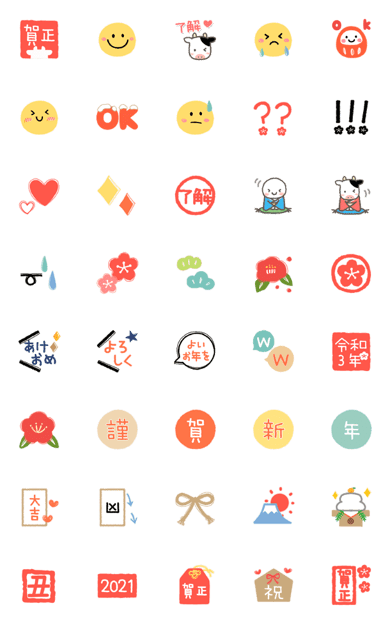 ざっくりと書いた手書きタッチがとってもかわいい。年末年始に便利に使えるかわいい絵文字です。年始のご挨拶や年賀状がわりに。基本のアイテム入り。2021年用改訂版。