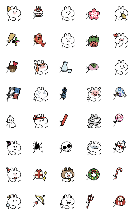 他の繋がるうさぎときどきにんじん絵文字と組み合わせて使えます。こちらはイベント、季節の絵文字です。誕生日、正月、ハロウィン、クリスマスや季節の挨拶にどうぞ。