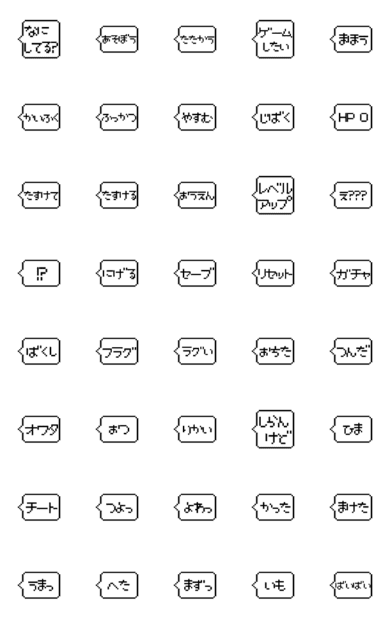 ドット絵のレトロゲーム風のフキダシに、ゲーマーさん、ゲーム好きさんが使えそうな言葉達を詰めた絵文字です。